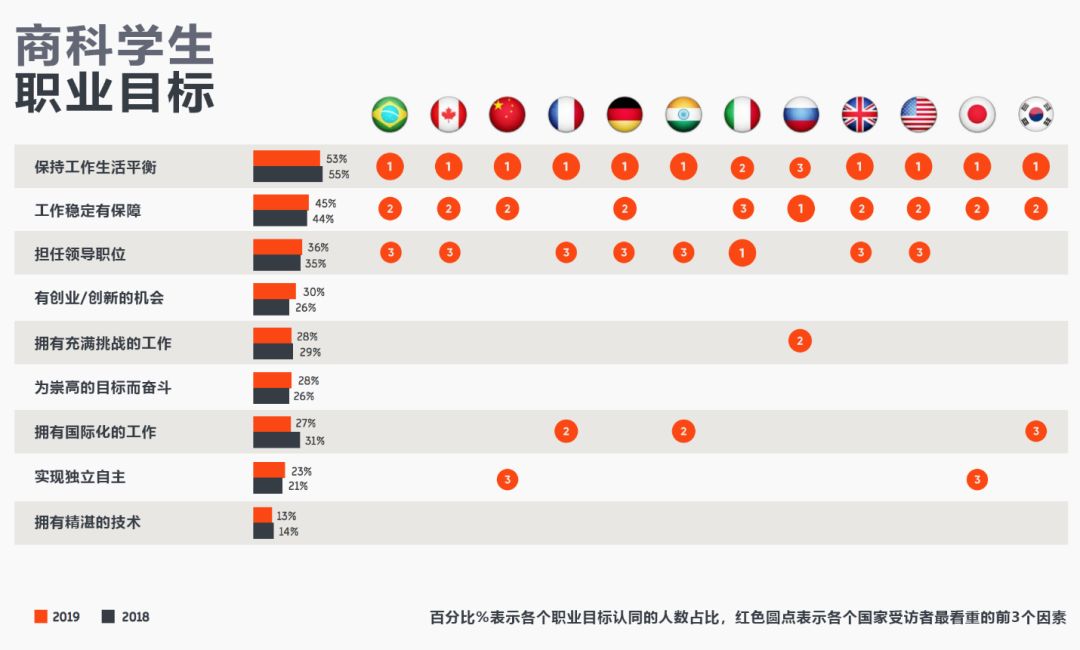 该调查还询问了受访者的职业目标。对于商科学生来说,最大的职业目标依然是保持工作与生活平衡,但这个职业目标的重要程度与去年相比稍有下降。约53%的受访者将保持工作与生活的平衡列为他们的职业目标,而去年这个数字为55%。与此同时,工作稳定性从44%上升到45%。与去年相比,增长最快的是“有创业或创新的机会”,从去年的26%上升到30%,成为受访者中第4个最受欢迎的职业目标。降幅最大的则是“能够拥有国际化的工作”,从31%降至27%。