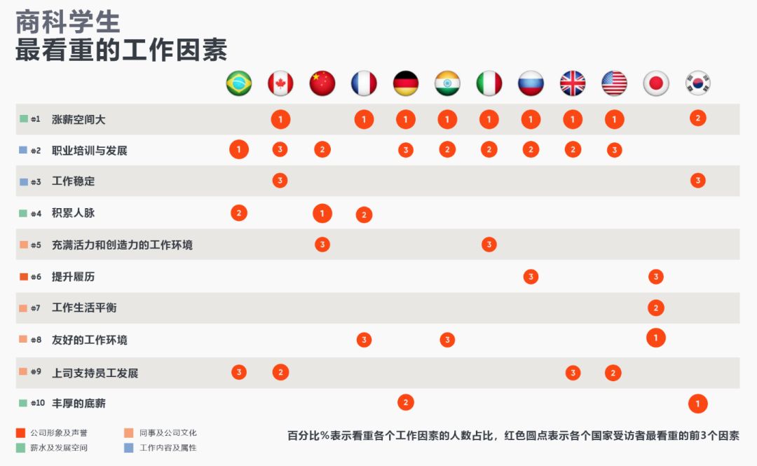 受访者在一份工作中最看重的因素依然是未来涨薪空间大,在受访的12个国家中,有9个国家的受访者认为这是最重要的因素。第2受欢迎的因素则是职业培训与发展,第三名则为工作稳定,而最不受重视的因素则是丰厚的底薪。