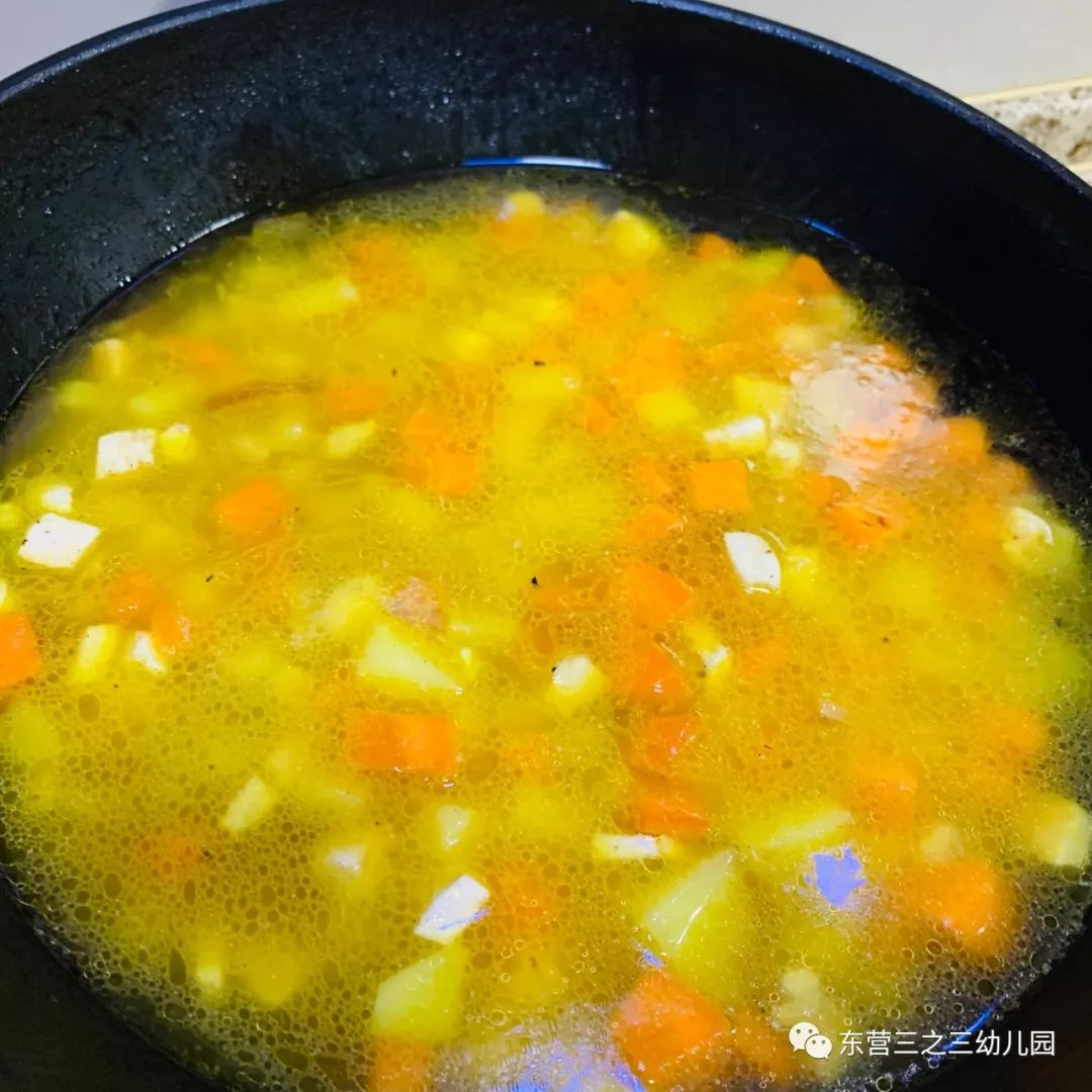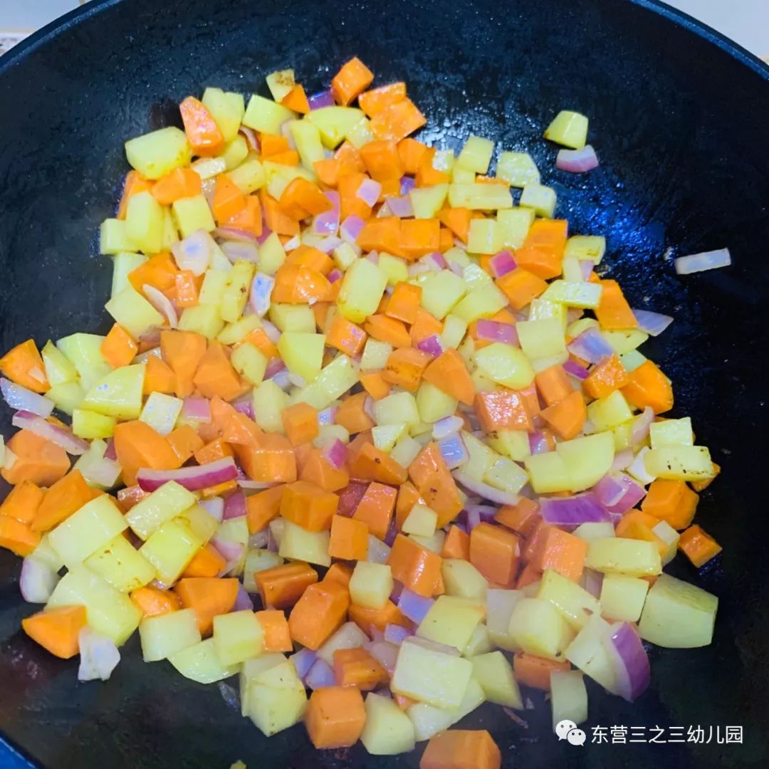 先炒土豆表皮松软后再放胡萝卜,