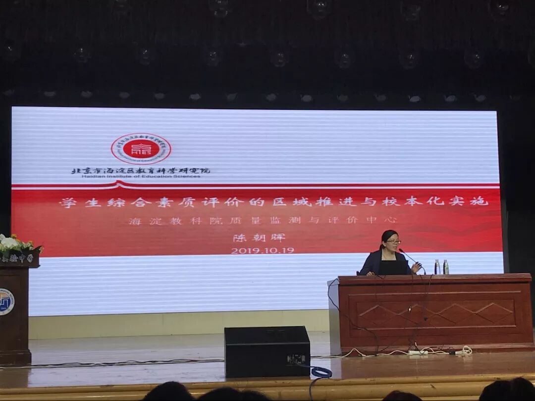 最后,北京海淀区教科院陈朝晖博士作了《中小学生综合素质评价区域推进与校本化实施探讨》主题发言。陈博士先从什么是综合素质评价谈起,具体分析其目的,重点阐释如何实施学生素质评价。她指出,学生综合素质评价实施是一个与课程改革同步,从区域到学校推进——校本实施”是学生综合素质评价有效实施的基本路径,是从上而下的推行,关键在于顶层设计。同时,她与在场同仁分享了自己调研时各区域学生综合素质评价工作的情况,并对上海、潍坊和长沙市的相关工作予以了高度的肯定。此外,她对我校杨小华等老师在过程性评价时所做的时间管理本做了重点分享和高度评价。