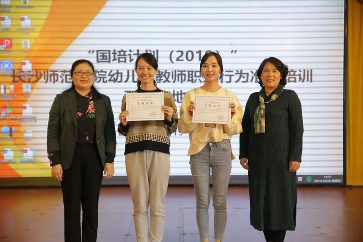 长沙师范学院附属第一幼儿园执行园长庄丽、娄底市直机关幼儿园园长罗云娥为授课老师颁发证书。