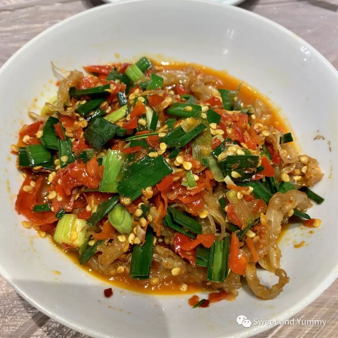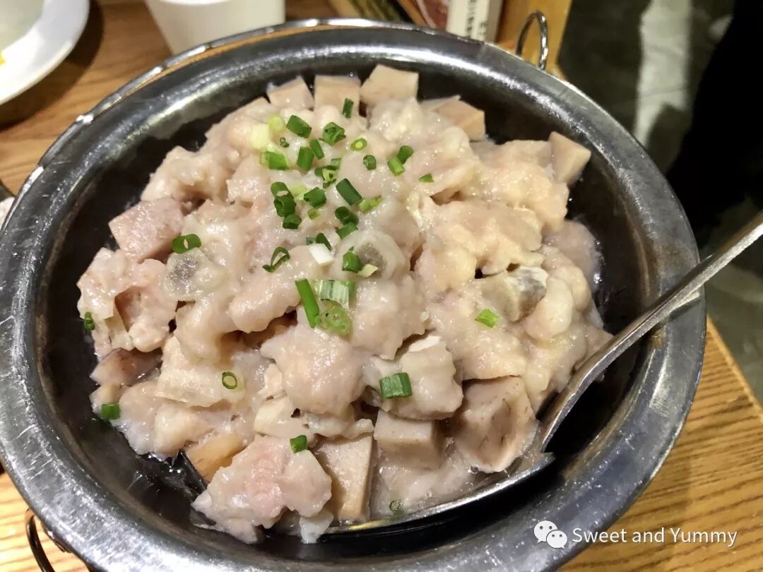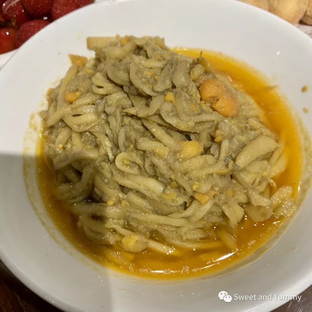 关于口味,咸蛋黄茄子,茄子去皮切条炒的很软,裹上沙的咸蛋黄碎,真是万物皆可咸蛋黄;酸萝卜牛百叶,一级下饭,酸萝卜居多,牛百叶好吃;糖饺子,约等于糍粑,空气感更强,超多黄豆粉是我的爱;冰镇杨梅,杨梅心子太软,略甜不太喜。