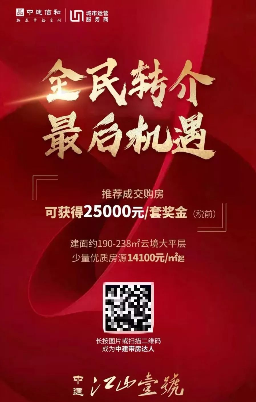 今天,小编看到一张图片,中建江山壹号,开启全民转介了,佣金高达25000!少量房源14100/㎡起。一般来说,开发商为了鼓励推荐客户,有时候会有一些转介费,但一般是几千元,或者购物卡什么的。