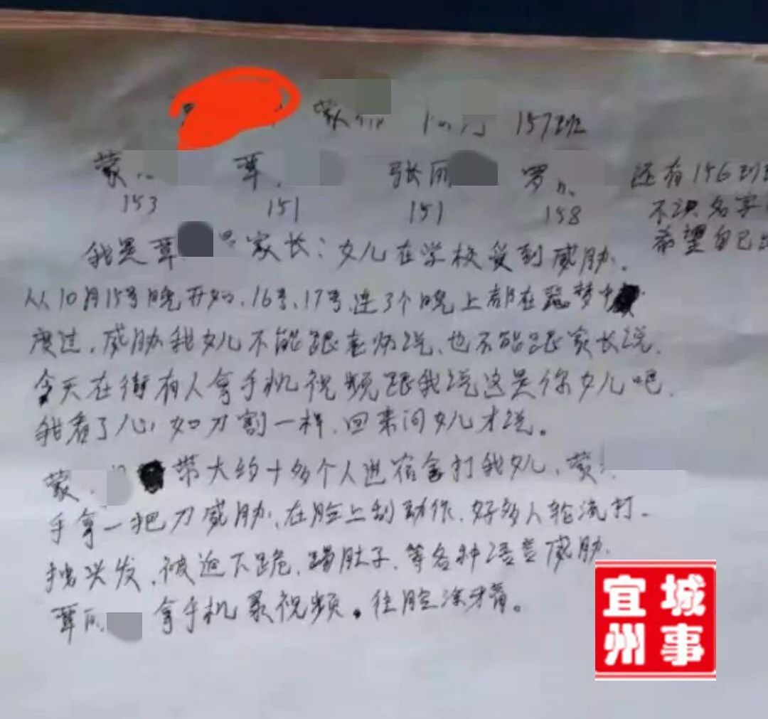“我是覃某某的家长,女儿在学校受到威胁,从10月15日晚开始,16日、17日连续三个晚上都在噩梦中度过,(对方)威胁女儿不能跟老师说,也不能跟家长说。今天在街上有人拿手机视频给我跟我说这是你女儿吧,我看了心如刀割一样,回来问了女儿才说。蒙某某带大约十多个人进宿舍打我女儿,蒙某某还拿一把刀威胁,在脸上(做)刮的动作,好多人轮流打,拽头发,被逼下跪,踢肚子等各种言语威胁,覃某某还拿手机录视频,往脸上涂牙膏。”