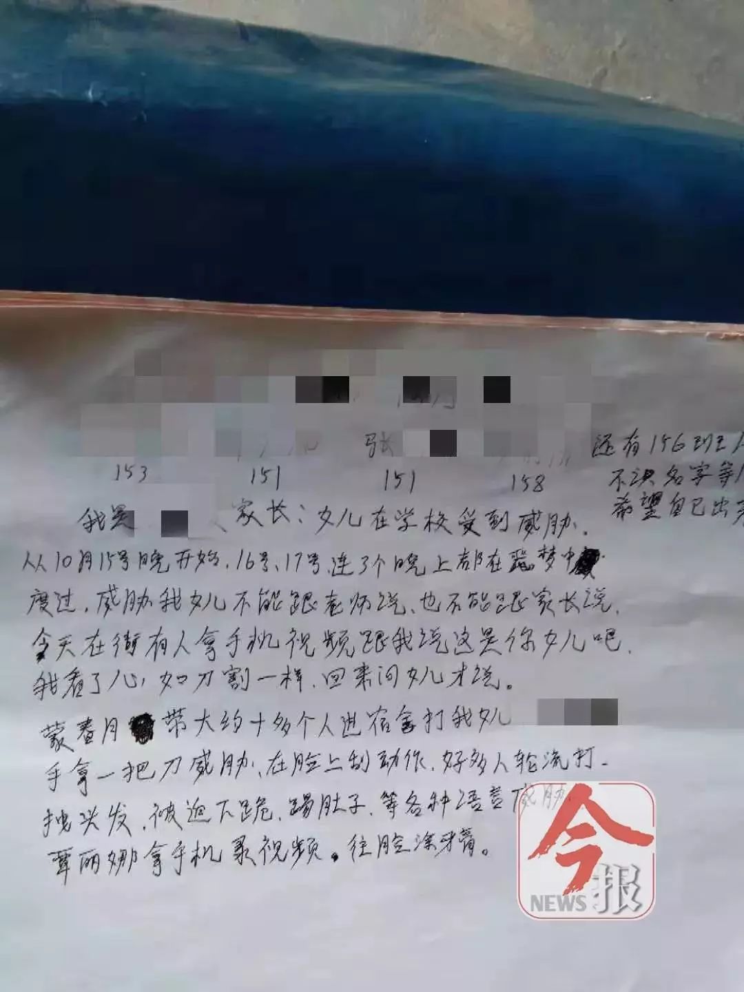 该求助信称:“我是覃某某的家长,女儿在学校受到威胁,从10月15日晚开始,16日、17日连续三个晚上都在噩梦中度过,(对方)威胁女儿不能跟老师说,也不能跟家长说。今天在街上有人拿手机视频给我跟我说这是你女儿吧,我看了心如刀割一样,回来问了女儿才说。蒙某某带大约十多个人进宿舍打我女儿,蒙某某还拿一把刀威胁,在脸上(做)刮的动作,好多人轮流打,拽头发,被逼下跪,踢肚子等各种言语威胁,覃某某还拿手机录视频,往脸上涂牙膏。“
