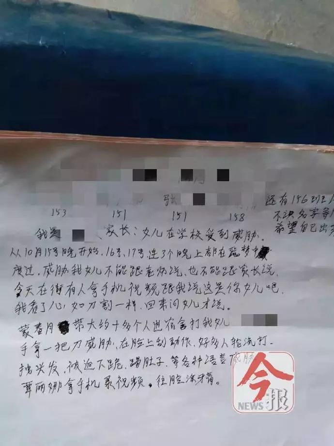除了欺凌视频疯传外,一则疑似被欺凌女生家长的求助信也在网上传播。该求助信称:“我是覃某某的家长,女儿在学校受到威胁,从10月15日晚开始,16日、17日连续三个晚上都在噩梦中度过,(对方)威胁女儿不能跟老师说,也不能跟家长说。今天在街上有人拿手机视频给我跟我说这是你女儿吧,我看了心如刀割一样,回来问了女儿才说。蒙某某带大约十多个人进宿舍打我女儿,蒙某某还拿一把刀威胁,在脸上(做)刮的动作,好多人轮流打,拽头发,被逼下跪,踢肚子等各种言语威胁,覃某某还拿手机录视频,往脸上涂牙膏。“