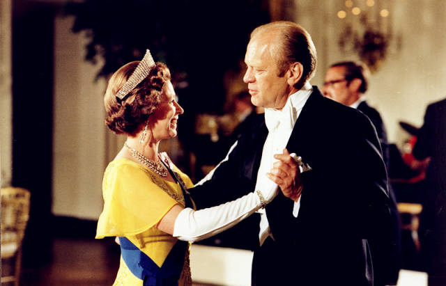 冠冕由488颗钻石镶嵌而成,其中最大的重达3.25克拉。女王穿了很多次,令人印象深刻的是与美国总统杰拉尔德?福特跳舞。