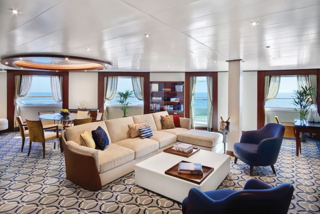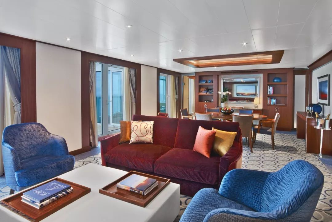 顶楼套房有41平方米,外加9平方米的阳台。内部起居区被设计成独立的卧室,还设有2-4人的餐桌与两台电视。顶楼套房还有Spa升级款——Penthouse Spa Suite,50平方米的内部空间加上16-19平米的阳台,可以在整个航程中享受Spa Serene Area和Spa礼宾服务。