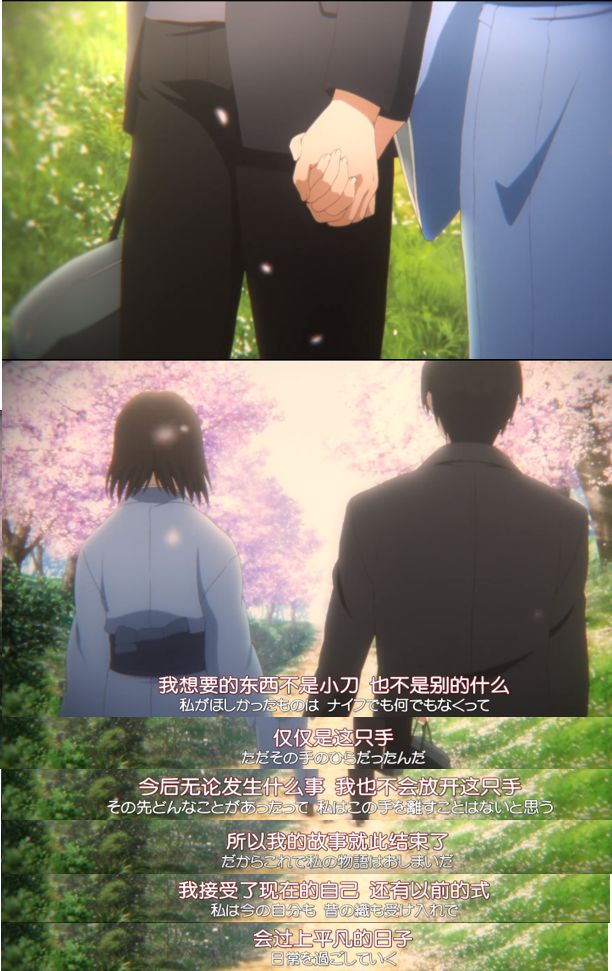 作品的结尾,两仪式和黑桐干也结婚生子,这一点在其余动漫电影中十分少见,也是这部作品成功收获大批死忠粉的原因之一。