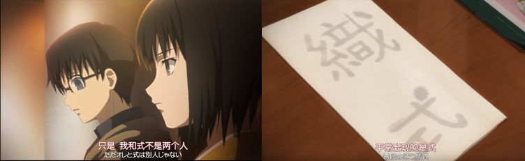 两仪式向黑桐干也坦明,因为家族的原因,自己有“式”和“织”两种人格,而自己的内在人格“织”保有杀人的冲动,建议干也远离自己。