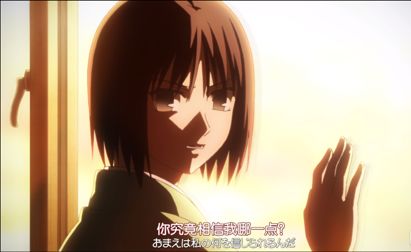 黑桐干也: 无所谓啦。但我想那是因为我很软弱,因为我没有胆量与全东京的市民为敌活下去,所以我会自杀。因为这样比较轻松对吧, 一时的勇气和永久的勇气,哪个比较难,一目了然吧。这点我无法否定也无法反驳,因为我也是弱小的人类。