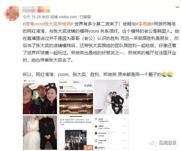 郑俊英也是yooni的好朋友之一,郑俊英的餐厅在法国开业时,她也带着张大奕去了。看到这里真是让人感叹,这个世界的圈子还真是小。