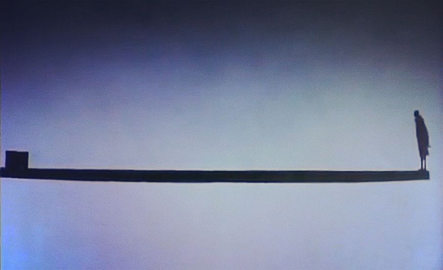 最后一个男子利用手段把其他人全部推了下去,但是为了保持平衡,他只好跟箱子在平衡的两端遥遥相望......