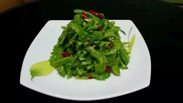(2)将苦瓜条加辣椒丝和精盐脑。后,控出水分,然后放凉开水中浸凉捞出,放人酱油、豆瓣酱、蒜泥和熟油拌匀即可。