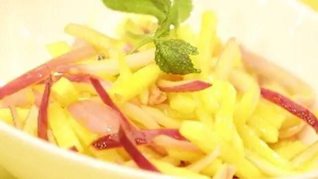 香蕉和芒果都是香味浓重的水果,添加柠檬汁可以让沙拉更加清爽,夏季加入冰淇淋是再好不过的选择!