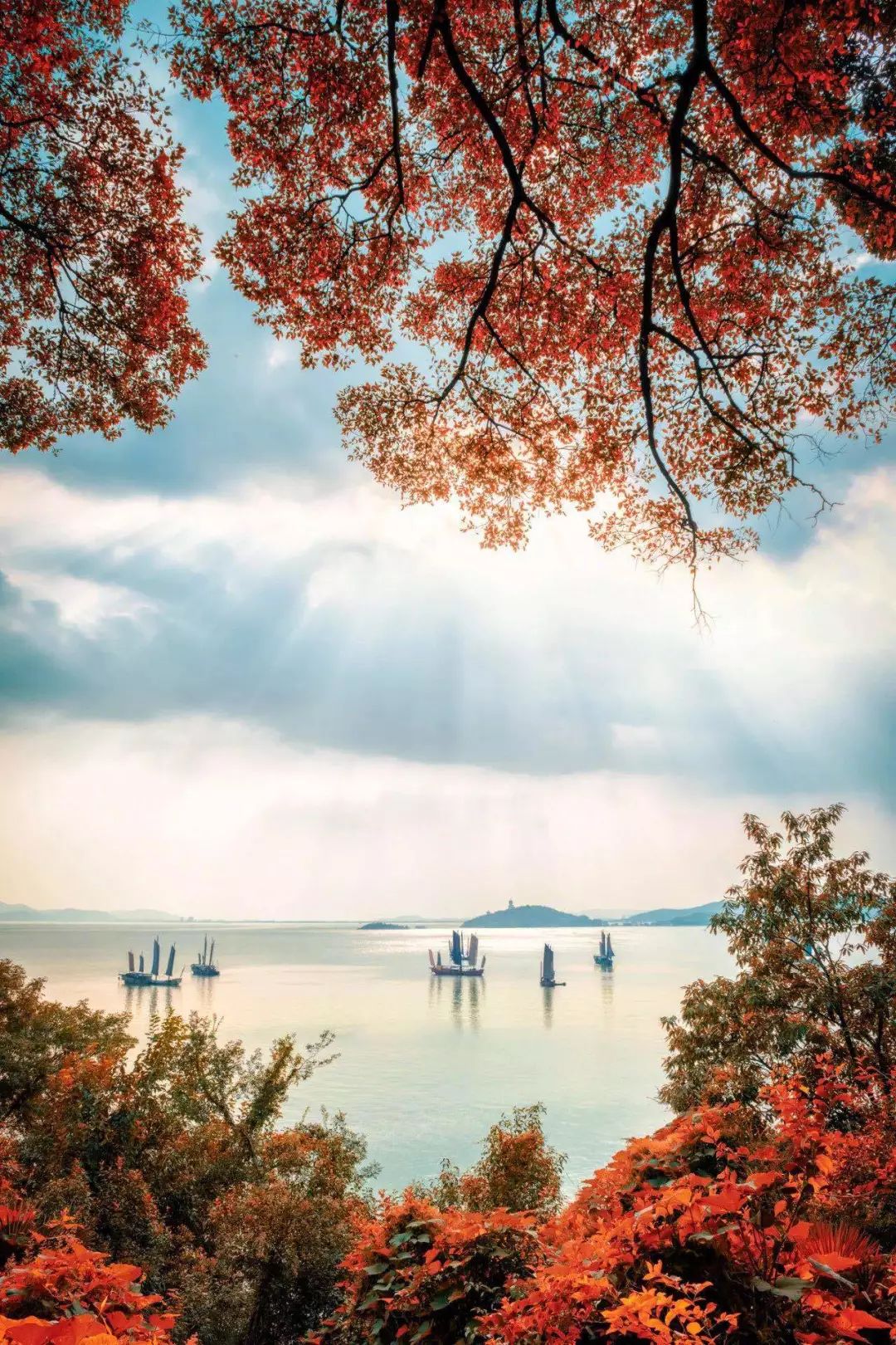红枫、碧水微荡、渔船杨帆、渔音袅袅
