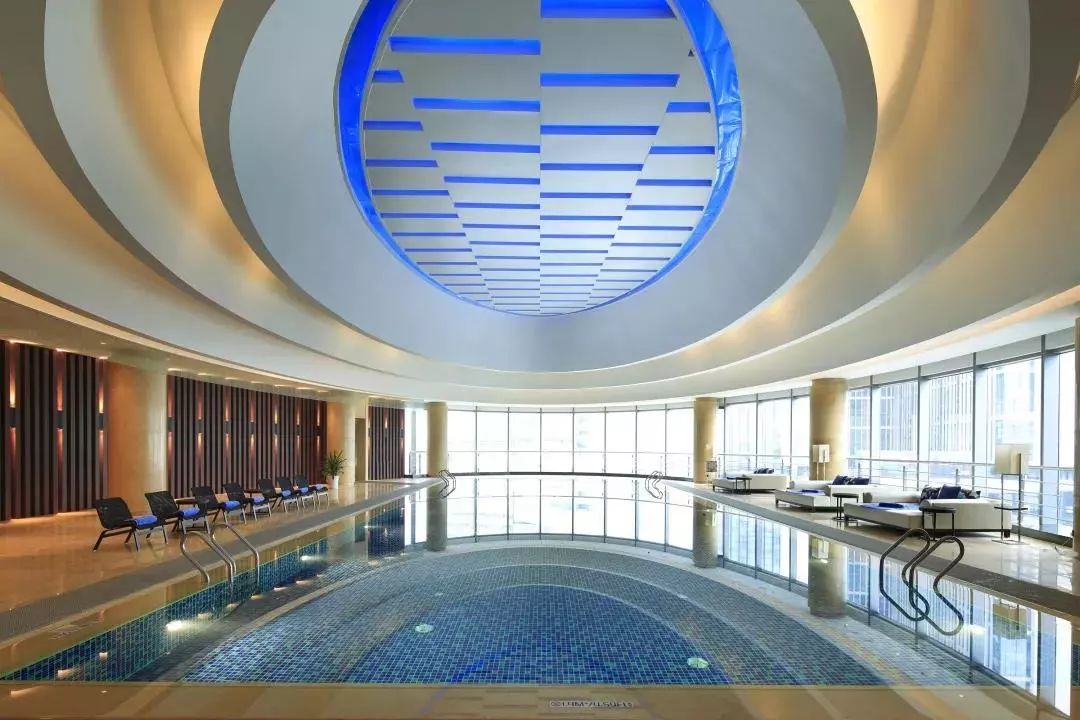 全景观泳池水质清澈,搭配弧形吊顶的蓝色波光设计,通透明亮。外墙落地窗围绕,饱览窗外繁华的同时也能享受到一份别样的日光浴。亲测水温舒服,适宜宝宝游泳哦!