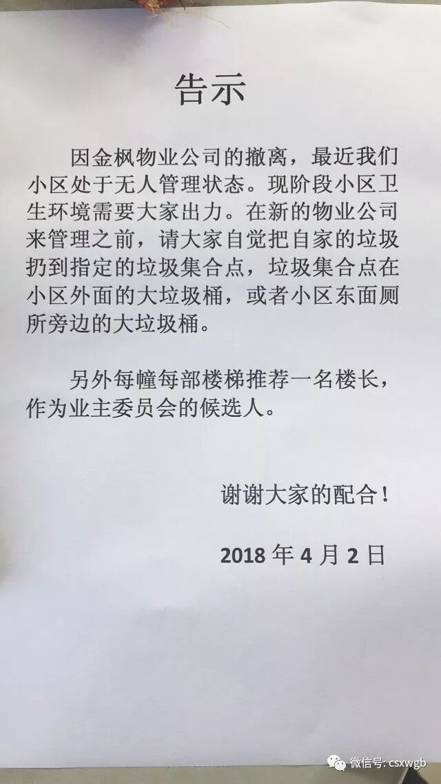 先要在小区里公告,再向社区通报,提前三个月告知的,公告是2017年年底,给他们三个月的时间准备的,我们接到通报也和属地政府进行了沟通,让他们组建业委会,重新选定新的物业。