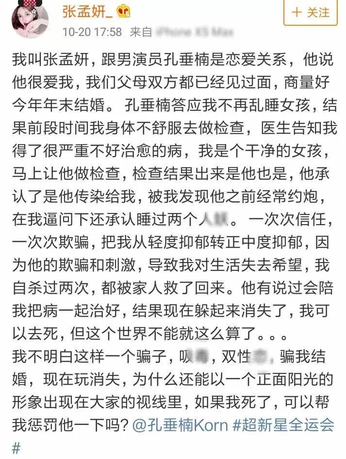 不仅如此,该网友还表示自己和孔垂楠原本打算于今年年底结婚,但是孔垂楠私生活混乱,还和人妖发生过性关系,导致自己患上了难以医治的病,而他不断的出轨行为更是让自己患上抑郁症,还曾经产生过自杀。