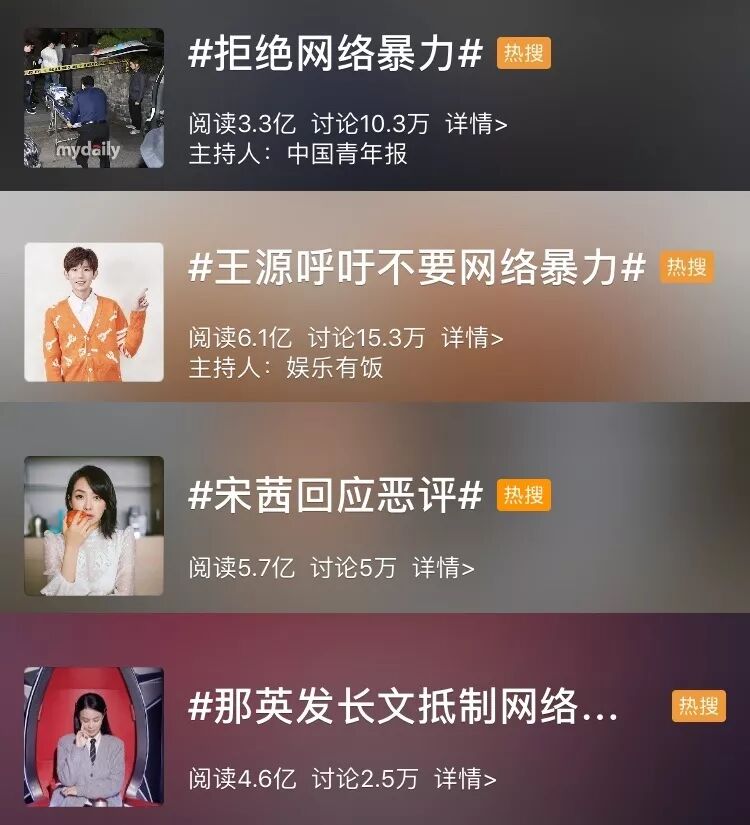 而围绕着网络暴力这一话题,近期也有多名明星艺人登上热搜。据不完全统计,由此产生的阅读量高达19.7亿。