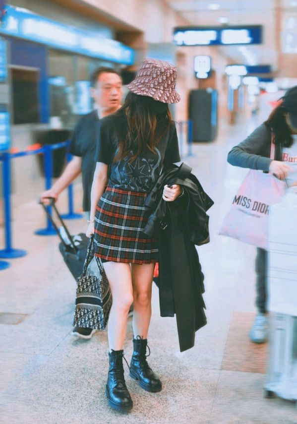 渔夫帽也是不少明星现身机场必备的单品,尽显时尚青春的气息。这次她身穿一款黑色的印花T恤,搭配上格子短裙,依旧很有学院风气息。脚踩上一双黑色的马丁靴,不仅时尚还很好的修饰了她的腿型,浑身散发出帅气的魅力!