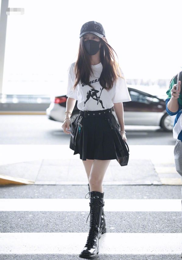 换上了另一身造型,这次辣妈杨颖选择了黑白配的造型现身。这次她选择了棒球帽与口罩出自出行,显得非常低调。而白色额T恤搭配黑色的百褶裙也显得很时尚休闲,尽显学院风气息。脚上的这双机车靴就很好的点亮了整体造型,使得杨颖很有暗黑少女的既视感,机场秀就更加出众啦。
