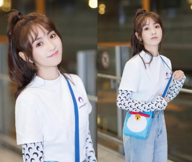 怎么把简单的白T穿出不一样的赶脚,不如配上一款图案简单的内搭,再配上蓝胖子卡通包,个性和可爱一下就都兼顾到了。