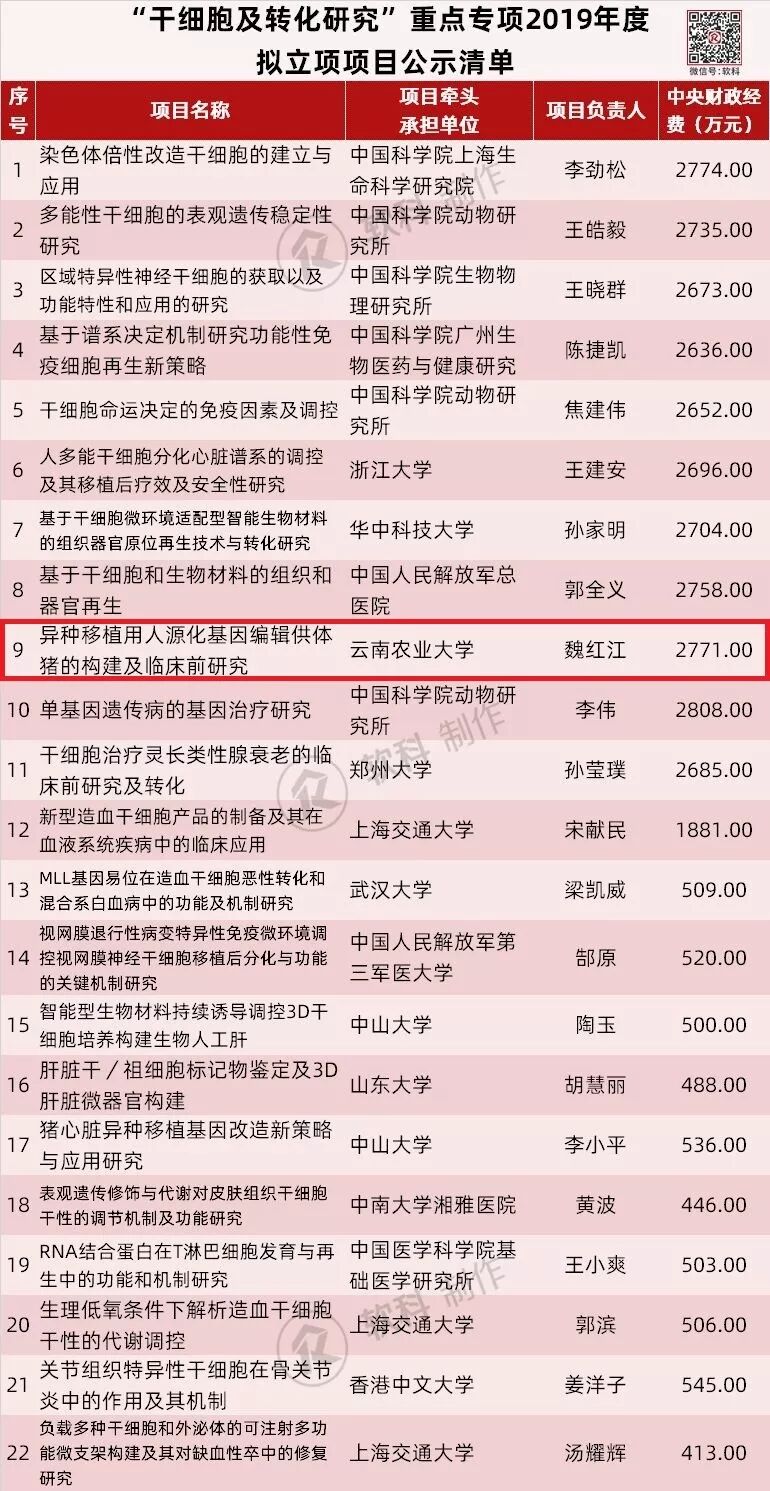 近日,科技部接连公示了9个国家重点研发计划重点专项拟立项项目清单,由云南农业大学动物医学院院长魏红江教授牵头主持的“异种移植人源化基因编辑供体猪的构建及临床前研究”项目获2019年度“干细胞及转化研究”重点专项立项,支助经费总额为2771万元。云南农业大学成为此次唯一获立项的非“双一流”高校,获助经费总额位居全国第13位、全国高校第7位,表现亮眼。