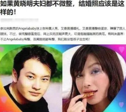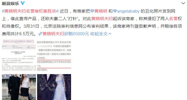 而4月2号的时候,有黄晓明和杨颖也维权成功了。据了解,有商家把黄晓明angelababy的丑化照片发到网上,借此宣传产品,直接说两人是打过针的人,不然的话,结婚之后的照片就是这样的。