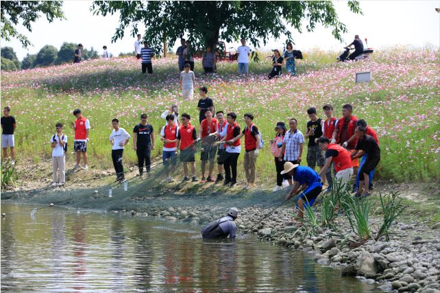 经过两个多小时的布网和等待,11时许,10位师傅和31位学生志愿者齐心协力收拢渔网。随着收网动作,一条条鲜活的鱼儿争相翻腾,不时跃出湖面围观的师生纷纷举起手机,拍下了这“鱼跃”的场面。