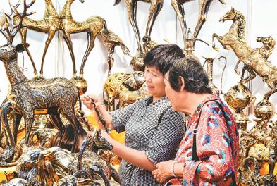 9月23日,在广西南宁举行的第十六届中国—东盟博览会上,“一带一路”相关国家的参展商带来的商品吸引众多参观者前来选购。图为参观者在南宁国际会展中心选购巴基斯坦青铜器。