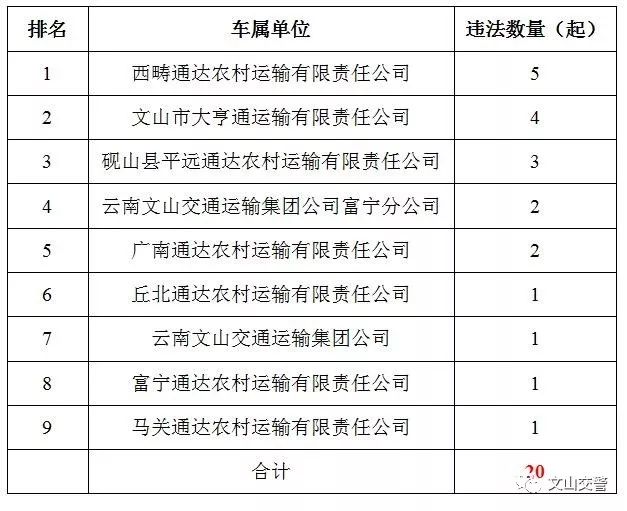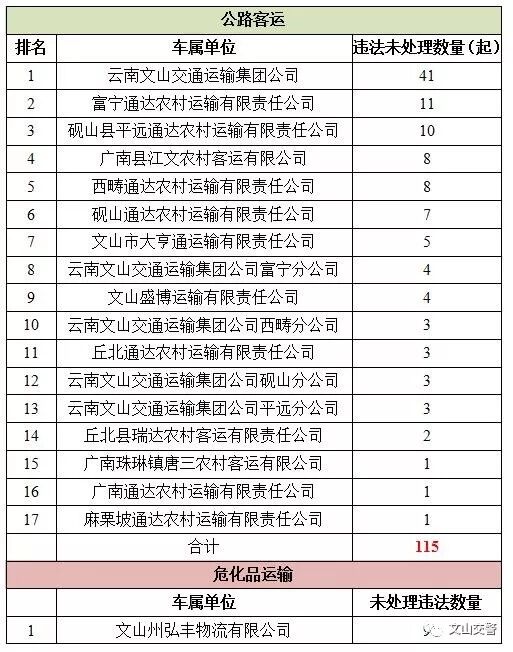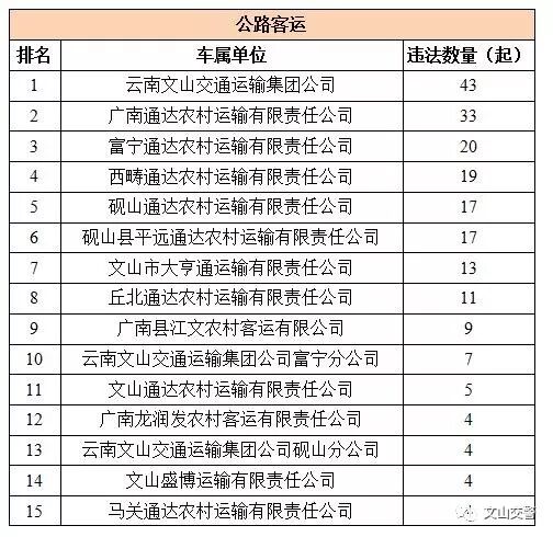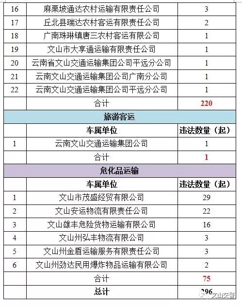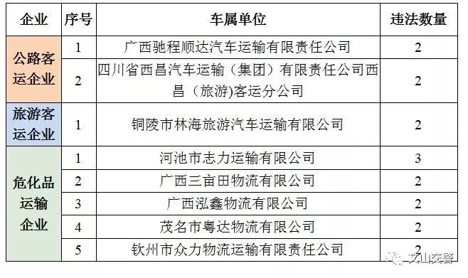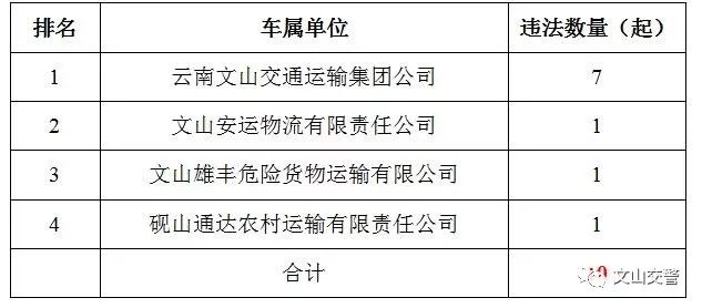其中,广南县江文农村客运有限公司的云H0W832车辆分别于3月、4月、8月共有3条交通违法未处理;云南文山交通运输集团公司的云H26326号车分别于6月、7月、8月共有3条交通违法未处理;文山州弘丰物流有限公司的云H28615分别于2月、7月、8月共有4条交通违法未处理等。