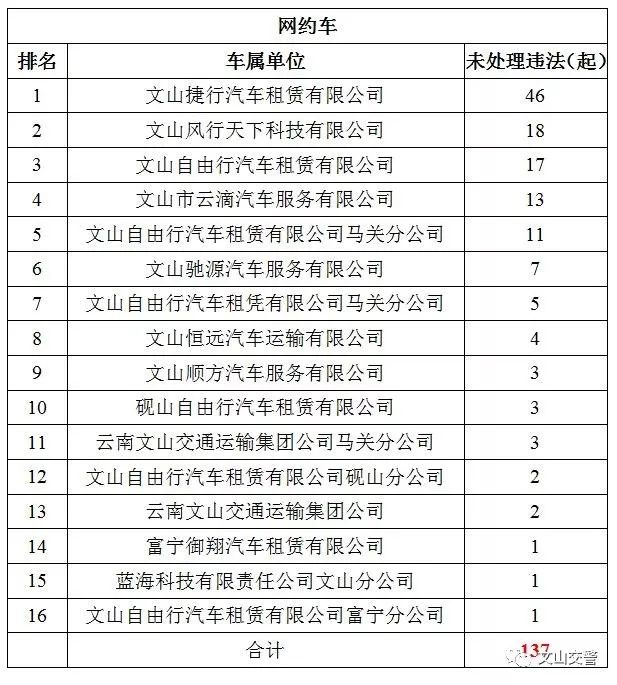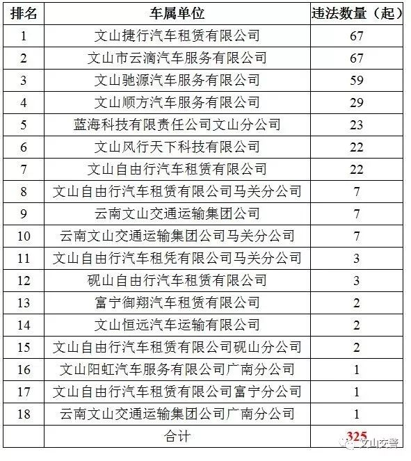 其中,文山风行天下科技有限公司的云H3Q170号车分别于8月、9月共有4条交通违法未处理;文山捷行汽车租赁有限公司的云H5J175号车于9月份共有3条交通违法未处理;文山捷行汽车租赁有限公司的云HCY135号车于8月、9月份共有4条交通违法未处理;文山自由行汽车租赁有限公司的云H6Q305号车于8月、9月份共有8条交通违法未处理。