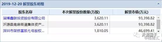 而此次解禁的股东则包括淄博鑫联投资股份有限公司、沂源县南麻街道集体资产经营管理中心、深圳市架桥富凯七号股权投资企业(有限合伙)。