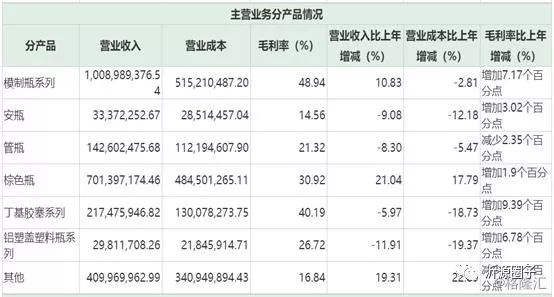 从2018年年报披露的数据来看,在这六大产品系列中,模制瓶系列产品期内贡献的营收为10.09亿元,占当年总营收的比例达到了39.03%,是上市公司最重要的产品。此外,棕色瓶、丁基胶塞系列、管瓶产品的营收占比也比较高。