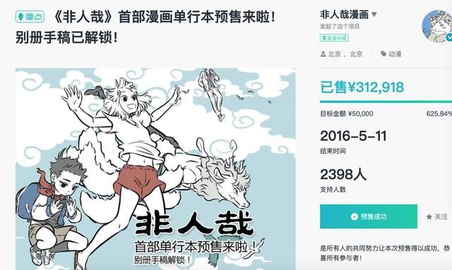 在统计的这176个项目中,基于漫画作品推出的绘本都有不错的表现。比如,2016年上线的《非人哉》第一部漫画单行本,完成率625.84%。这个项目,刷新了这个品类在当时的众筹金额。