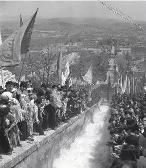 1958年10月,湖北、河南两省所属的襄阳、荆州、南阳3个地区17个县的10余万民工挑着干粮,带着简陋的工具(扁担、筐子、小木船),汇集到丹江口工地,运载着黏土、砂石,把汉江截流。