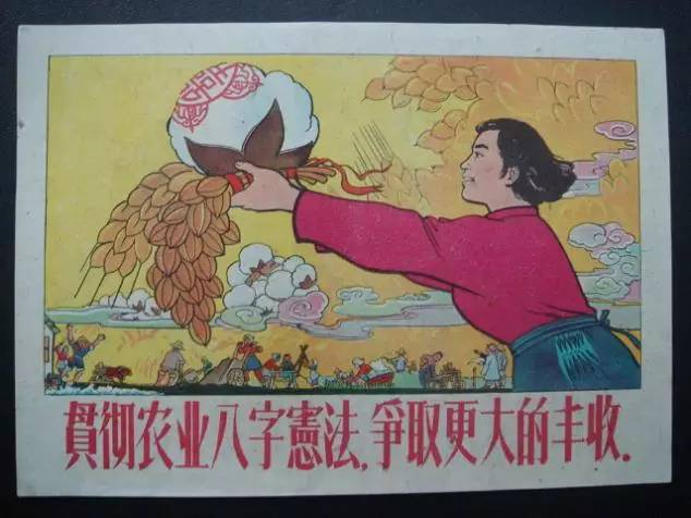 编者注:农业八字宪法,是指毛泽东根据我国农民群众的实践经验和科学技术成果,于1958年提出来的农业八项增产技术措施。即:土(深耕、改良土壤、土壤普查和土地规划);肥(合理施肥);水(兴修水利和合理用水);种(培育和推广良种);密(合理密植);保(植物保护、防治病虫害);管(田间管理);工(工具改革)。因地制宜地采取这些措施,对农作物稳产高产是很有效的。简称八字宪法。