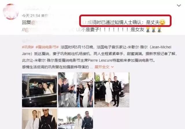 5月16号晚,某媒体在社交网站上发布巩俐在戛纳的动态,当中对于让·米歇尔·雅尔,他采用的是丈夫的昵称,评论区收到巩俐粉丝的质疑之后,该媒体直接回复网友,表示在成稿前已经通过知情人士确认,让·米歇尔的身份是巩俐的丈夫。