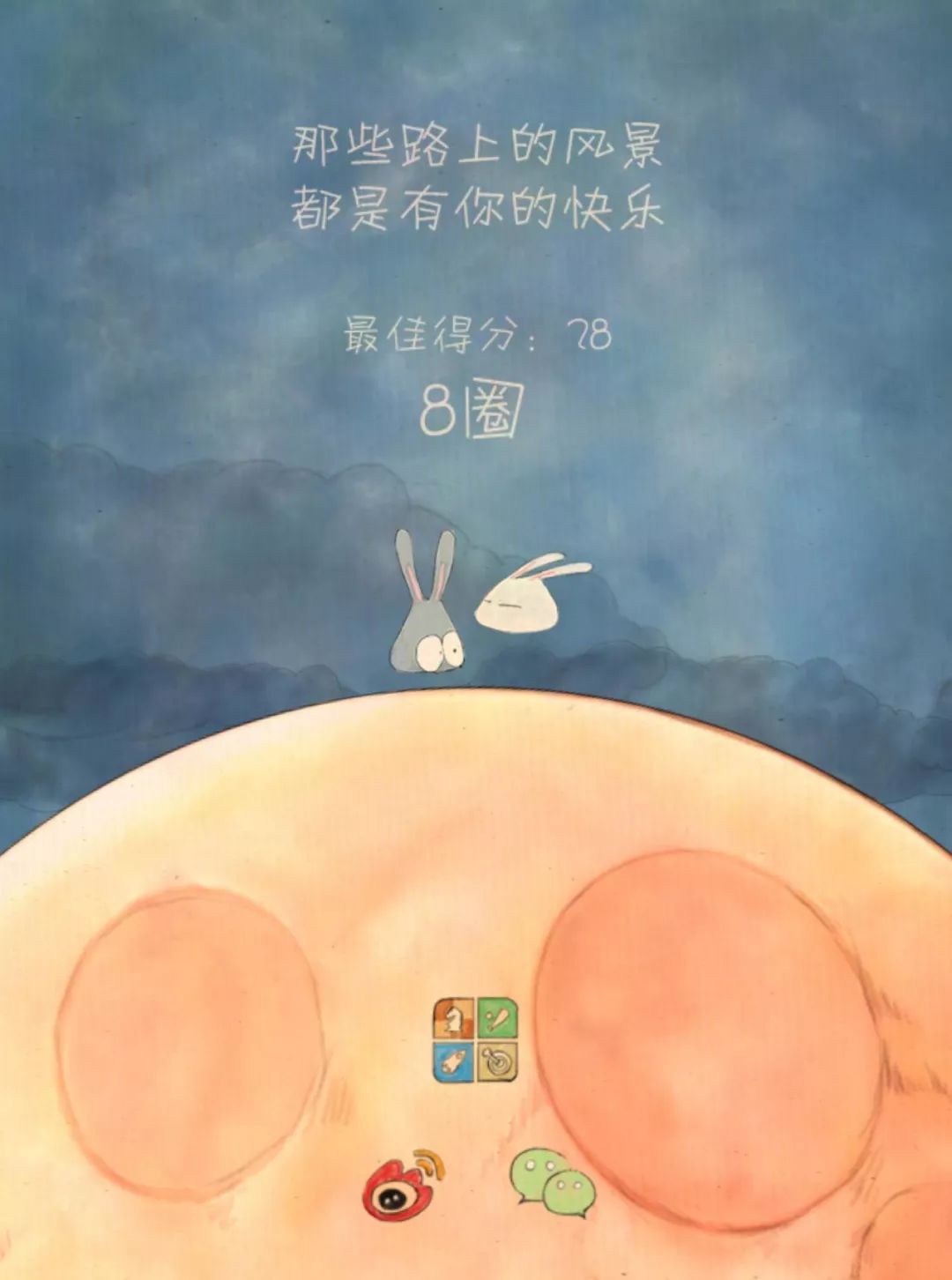 这个游戏名字听起来就很温暖很可爱。这款游戏是控制一只兔子和另一只兔子绕着月亮追逐,她们必须有接触,必须要一直在一起,这样才能一直维持有体力。