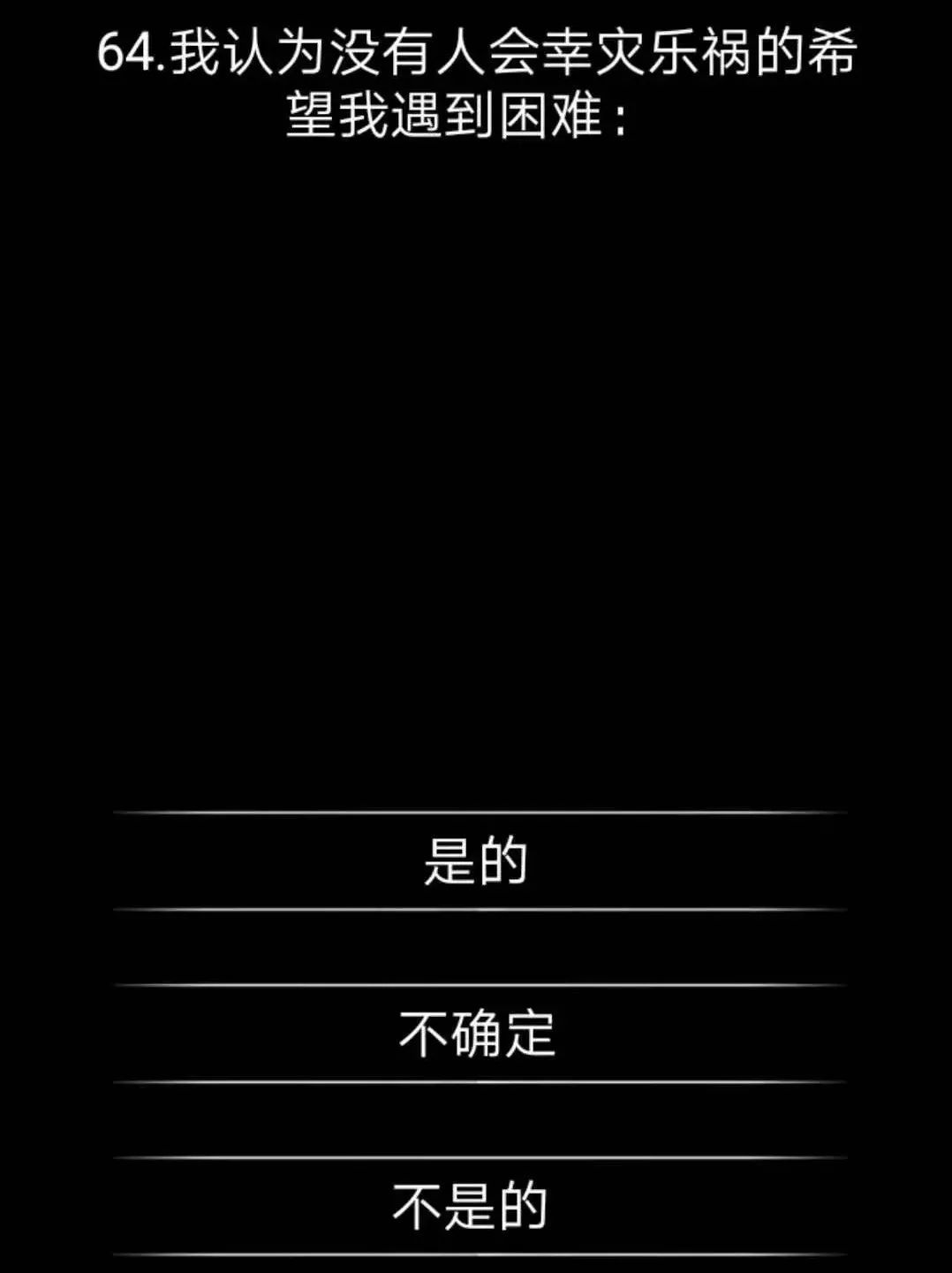 它全篇黑体白字,没有剧情没有游戏性,也没有操作。但是它的题目涉猎各个方面,有关于一个人的自身评价,有关于一个大范围对一些客观事物的选择,随机出现。