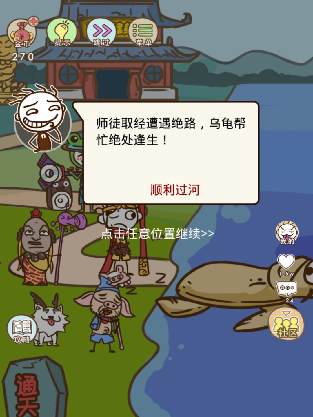 如果你直接点了乌龟,师徒四人都坐上了乌龟,那么很不幸他们都沉水底了。你一定要认真观察,手指灵活滑动。这时你就会发现五个里只有猪八戒可以移动,而且猪八戒恰恰是这几个中最重的。再仔细观察一下全图,有一个弥勒健身房,试试把猪八戒放进去吧,会出现神奇的现象,八戒瘦了!这时你再点击乌龟,大家就能一起搭乘过河了!