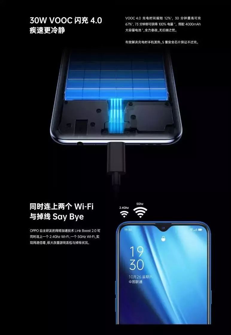 VOOC 4.0充电时间缩短12%,30分钟最高可充67%,73分钟即可获得100%电量,搭配4000mAh大容量电池,全力奋战,无后顾之忧。
