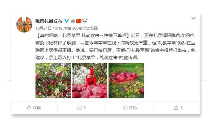10月21日,甘肃省陇南市礼县委员会对外宣传办公室官方微博“陇南礼县发布”也表示,“尽管今年苹果在线下滞销较为严重,但礼县苹果在仍然在互联网上卖得很不错”。