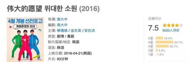 《小小的愿望》改编自韩国电影《伟大的愿望》,影片上映期间达到了30万8457观影人次,豆瓣评分7.5,好于70%的喜剧片,口碑还是非常不错的。