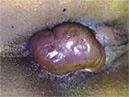 2.肿块呈暗紫色,圆形或椭圆形,大小不等,稍硬,触痛明显。