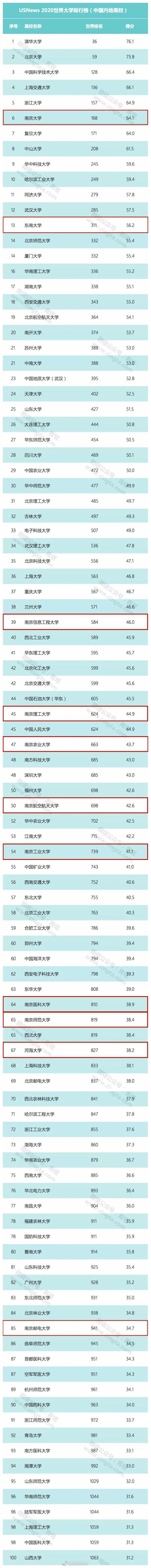 中国内地188所高校进榜,南京11所进入前100名