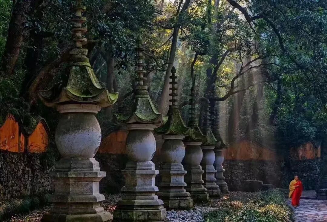 09:00 抵达国清寺,国清寺周边环境幽静,门前的隋塔历史久远保存完整!国清寺内外参天古树,门前小溪潺潺,风景 特别优雅。当你处在这千年古寺中,四周都是古木参天,除了鸟鸣声外就是低沉的诵经声。你会自然的沉静下来,摒弃现实中的所有杂念、躁动。