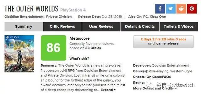 黑曜石工作室新作《天外世界》的媒体评分已在今晚解禁,截稿时 Metacritic 收录了 33 个评测,平均分 86 分,Opencritic 收录了 59 个评测,平均分 86 分,推荐率 96%。本作将于 2019 年 10 月 25 日发售,登陆 PS4/XB1/PC 平台,支持中文。