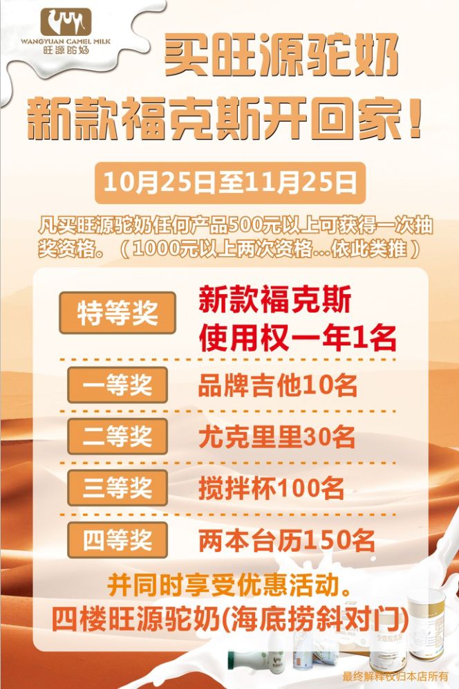 10月25—11月25消费满五百即可参与抽取特等奖: